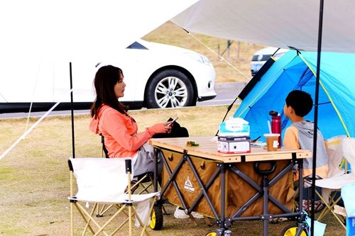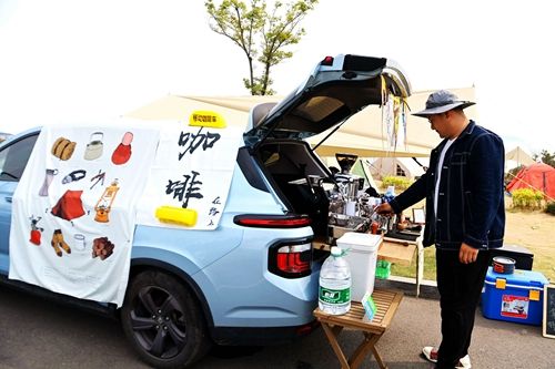2022年5月8日,山东青岛西海岸新区东环岛海滨公园,市民在露营地汽车上制作咖啡。