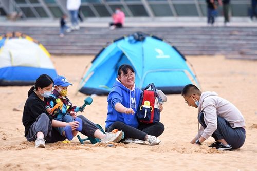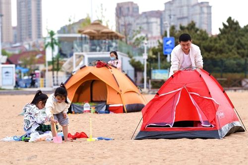 2022年5月8日,山东青岛西海岸新区金沙滩,市民在沙滩搭帐篷露营。