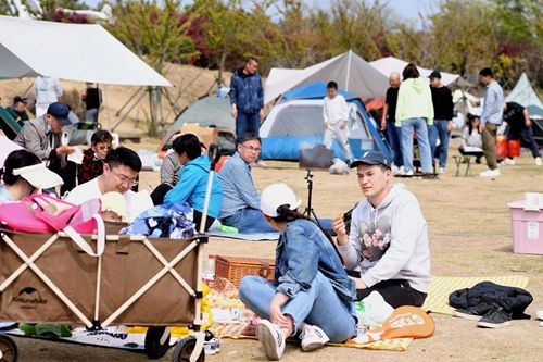 2022年5月8日,山东青岛西海岸新区东环岛海滨公园,市民搭帐篷在野外露营。