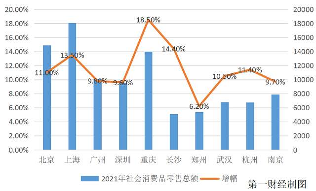 北京、上海、广州、深圳、重庆、武汉、长沙、郑州、南京和杭州被称为“2021年中国十大消费城市”,在该榜单中,深圳社会消费品零售总额以9498.12亿元位列第五,但同比增幅排名倒数第二。