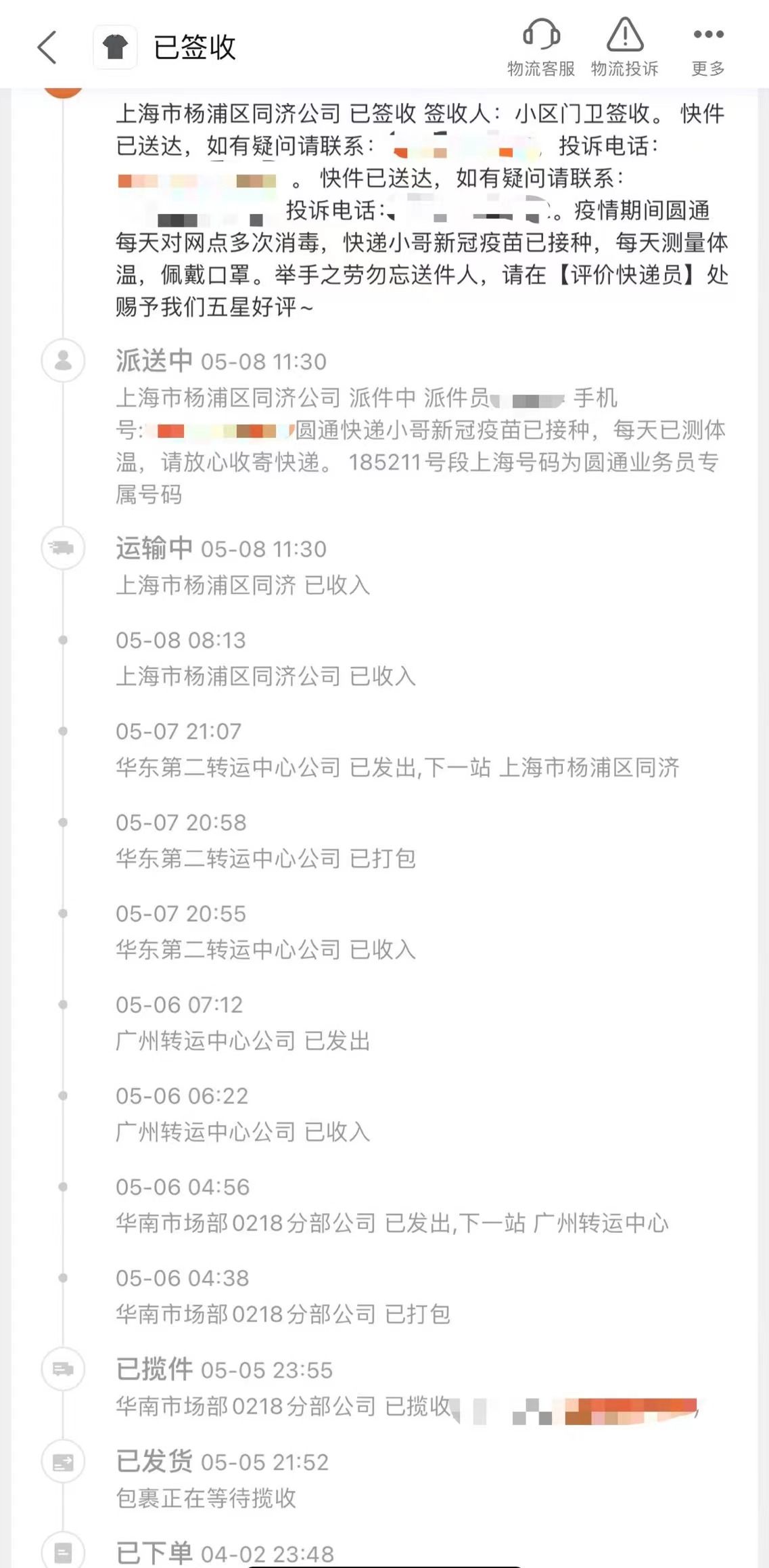 “已经收到了两个3月底和4月初下单的圆通包裹,5月5日显示已揽件,5月6日显示从广州发出。”家住杨浦的王女士说道。