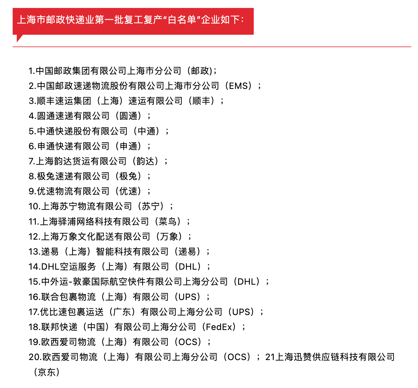 5月8日,上海市邮政管理局发布第一批复工复产“白名单”企业。包括顺丰快递、中通、圆通、申通、韵达、极兔、菜鸟、京东等20家快递物流企业,已开始复工。