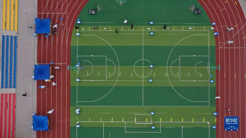 5月10日,在青海省西宁市城西区文汇小学核酸采样点,市民在排队进行核酸采样(无人机照片)。