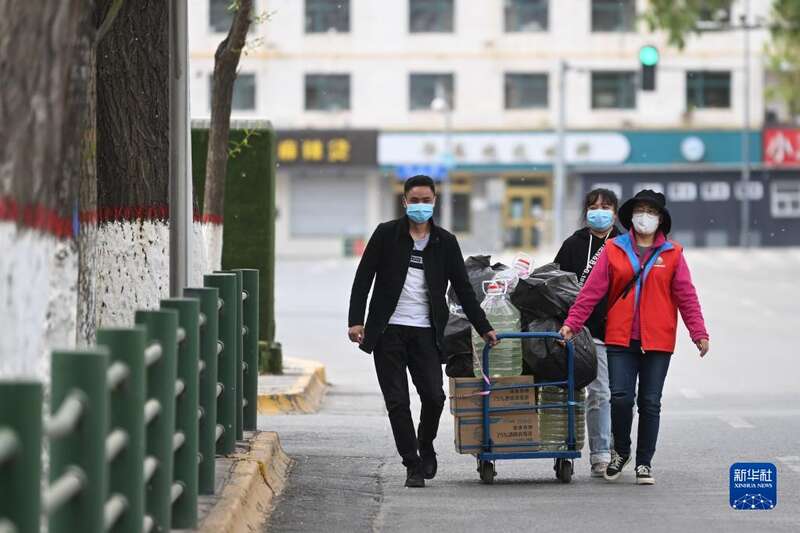 5月10日,在青海省西宁市城中区南山东社区,社区工作人员在运送防疫物资。