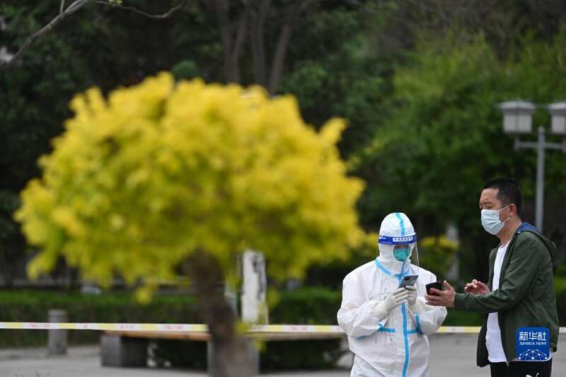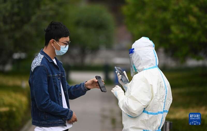 5月10日,在青海省西宁市城西区虎台遗址公园核酸采样点,工作人员对参加核酸采样的市民进行扫码登记。