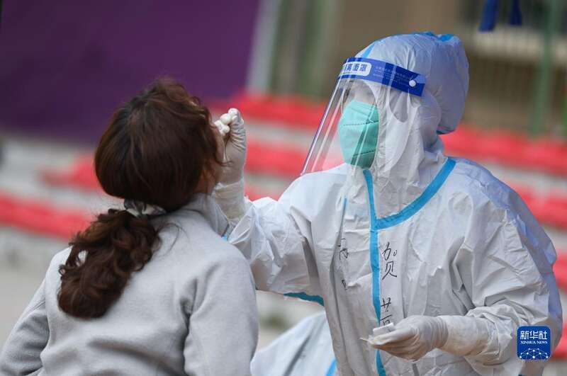 5月10日,在青海省西宁市城西区文汇小学核酸采样点,医务人员为市民进行核酸采样。