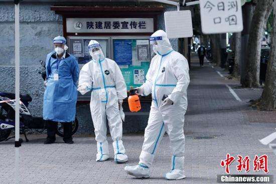 在瑞金二路临时核酸检测采样点,工作人员正在对环境进行消毒。