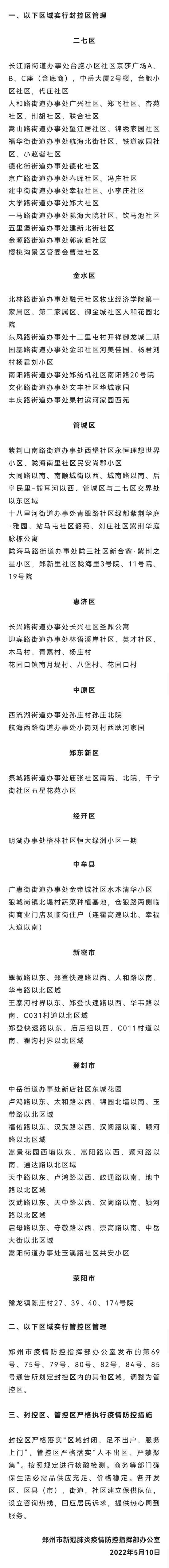 5月10日,河南郑州市新冠肺炎疫情防控指挥部办公室发布关于调整封控管控区域的通告: