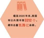 数据统计,截至2020年末,我国有公共图书馆3212个,藏书总量11.79亿余册,实际使用房屋建筑面积1785.77万平方米,平均每万人公共图书馆建筑面积为126.49平方米。