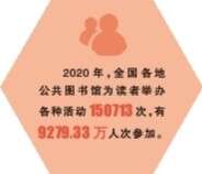 数据显示,全国各级公共图书馆普遍开展讲座、展览、阅读指导、读书交流、演讲诵读等活动。仅2020年,各地公共图书馆就为读者举办各种活动150713次,有9279.33万人次参加。