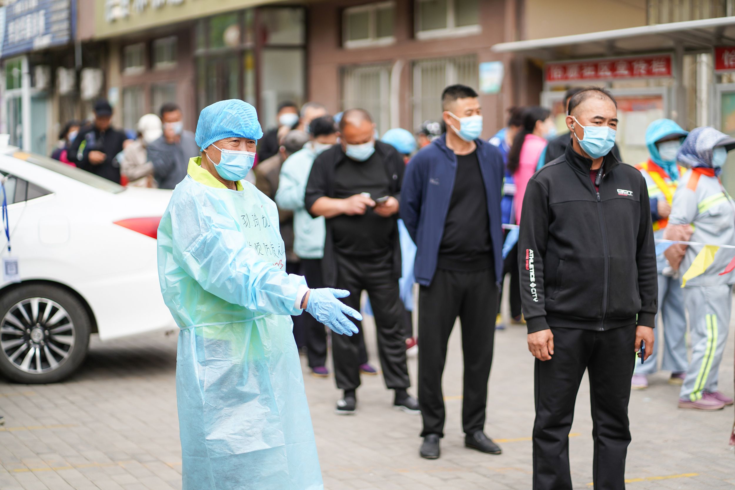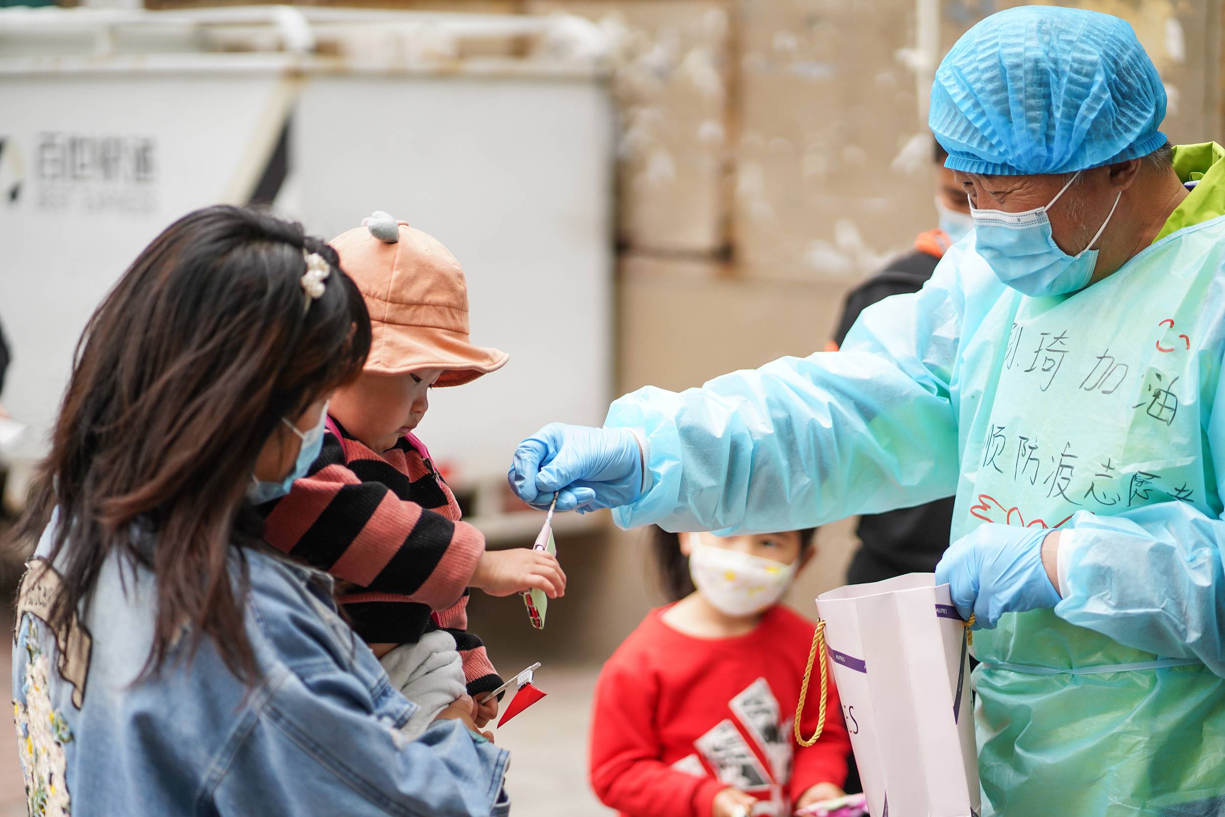 2022年5月7日,青岛市,“折纸爷爷”孙琦正在李沧区沧口街道怡顺社区核酸检测点做志愿服务。66岁的沧口街道居民孙琦是一名党员志愿者,也是当地小有名气的“折纸达人”,他利用一个多月的时间制作了上千个折纸玩具,免费赠送给前来做核酸检测的小朋友,帮助他们化解紧张情绪,积极配合检测。