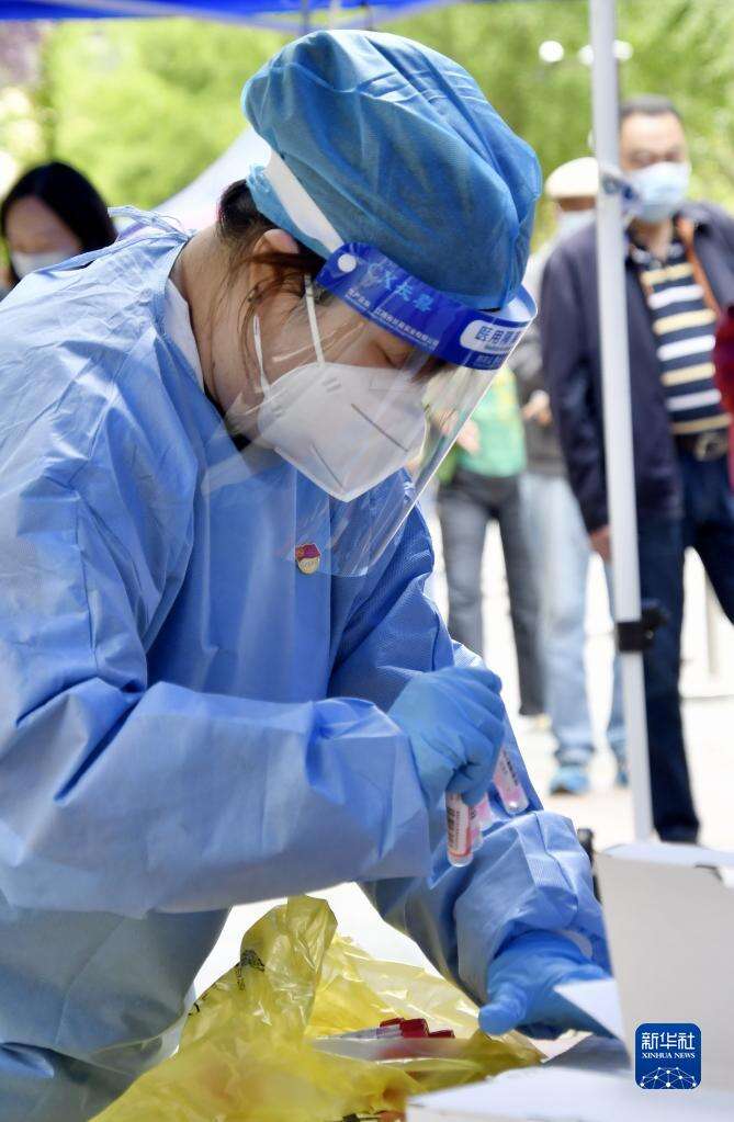 5月11日,共产党员、八里庄街道远洋天地家园社区社工孙怡在核酸筛查现场收集核酸采集样本管。