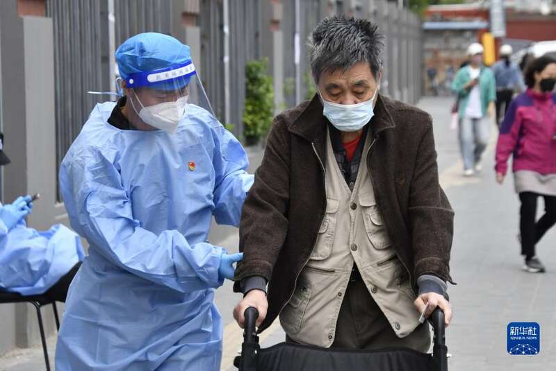 5月11日,共产党员、复员军人高丰(左)在八里庄街道西里社区核酸筛查现场帮助参加核酸筛查的居民。