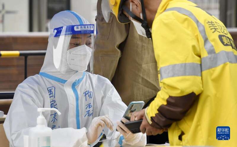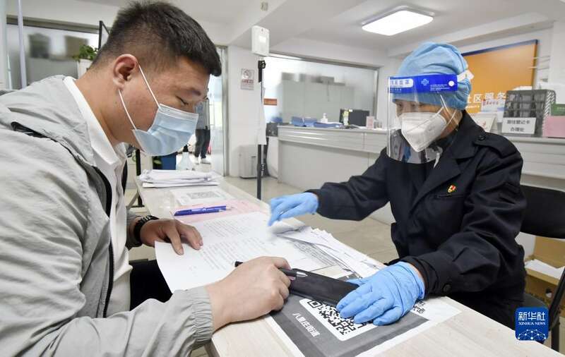 5月11日,共产党员、国家京剧院演员杨磊(左)在北京市朝阳区八里庄街道城市华庭社区参加核酸筛查登记等志愿服务。