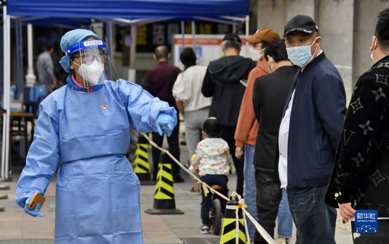 5月11日,共产党员、八里庄街道机关干部张茜(左)在核酸筛查现场进行秩序维护。