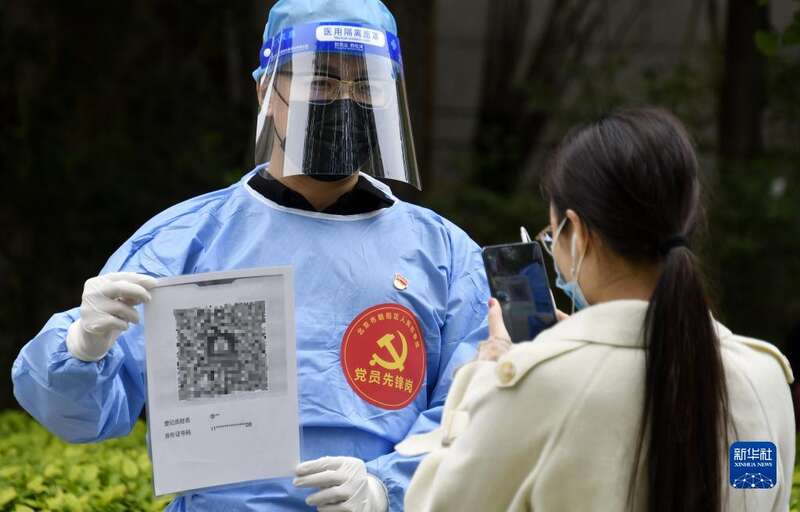 5月11日,共产党员、朝阳区检察院干部王天毅(左)在居住地八里庄街道远洋天地家园社区参加核酸筛查现场扫码等志愿服务。