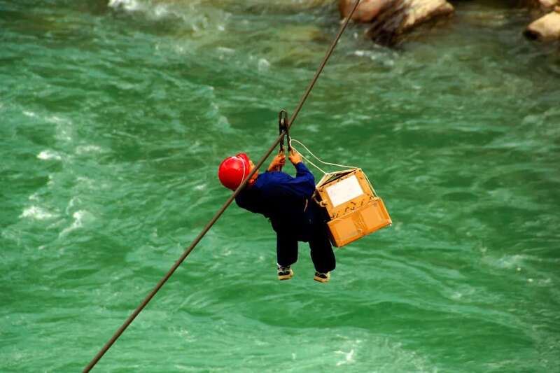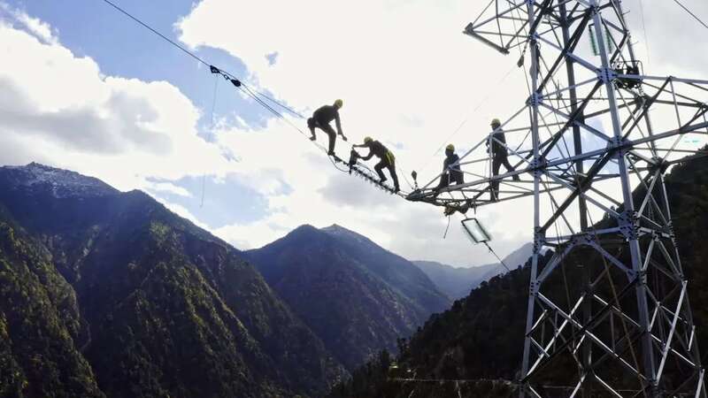 他们在山谷之间,攀岩架桥在河谷之上,跟蜘蛛一样溜索放线在丛林之中通过人力把一根根电线杆抬上山顶