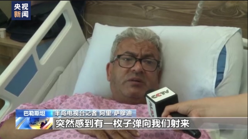 半岛电视台记者 阿里·萨穆迪:我们向前走了大约20米,突然感到有一枚子弹向我们射来,之后我们就停下来,感到十分害怕。然后我转过来,告诉希琳,咱们先往回走。因为以军在射击,然后我的背部就中了一枪。