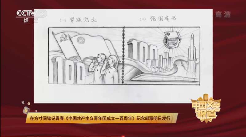 “中国共产主义青年团成立一百周年这一主题的概念相对比较抽象,但对我来说,有一个非常具体的场景,就是在天安门广场上,当年轻人喊出了‘请党放心,强国有我’这八个字的时候,我内心的某个地方被打动了。一百年,让我想起不忘初心。初心这个概念,会有一个形象联想——党徽,要永远跟党走,这样第一枚的主题就出来了。”
