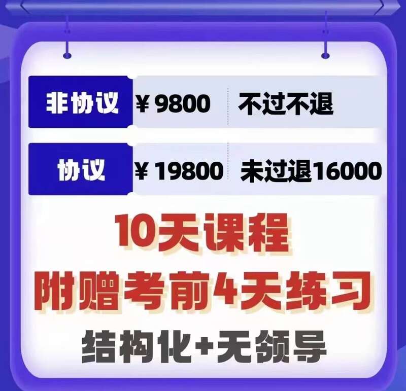 记者在多个微信公众号看到公考面试班的价目表,机构名为“考捷公考”九天九晚的广东省考面试协议班,价格26000元,承诺第一名不过全退费,第二名不过机构仅收3500元,余额退还;“北宋教育”国考、央选面试冲刺班六天六晚,协议班23800元,不过退18000元。