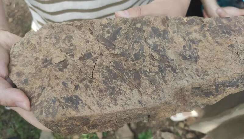 原来,2021级古生物学与地层学专业研究生柯易晖、薛钦元(培养单位:中科院古脊椎动物与古人类研究所,以下简称“古脊椎所”)校内课程实习踏勘中,无意间在教二楼附近发现了一枚留有植物印痕的石头,没过多久,其他同学也陆续在此附近发现了植物化石。