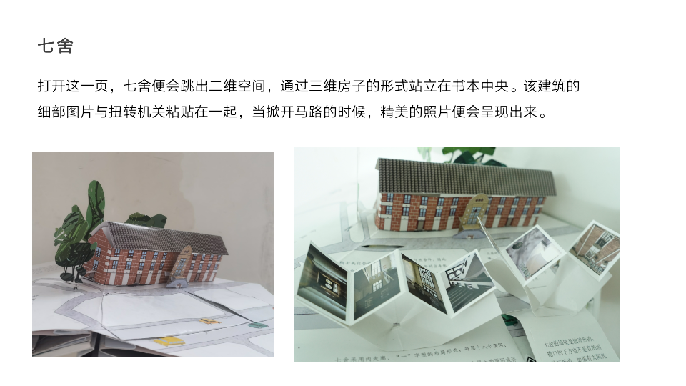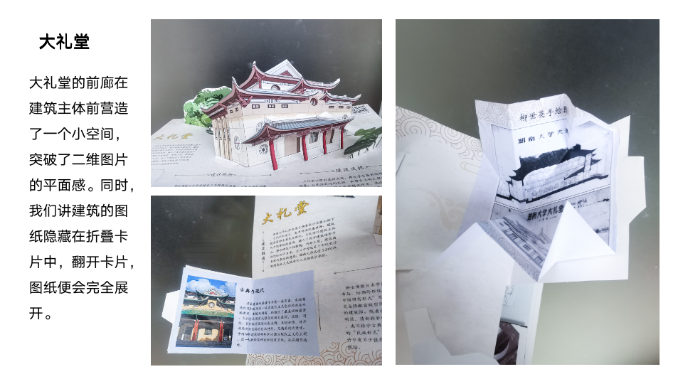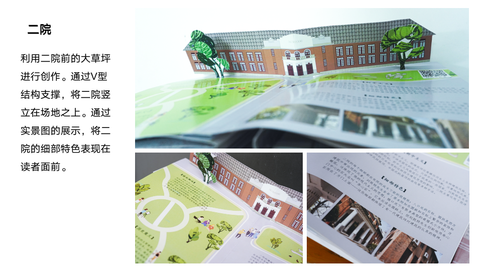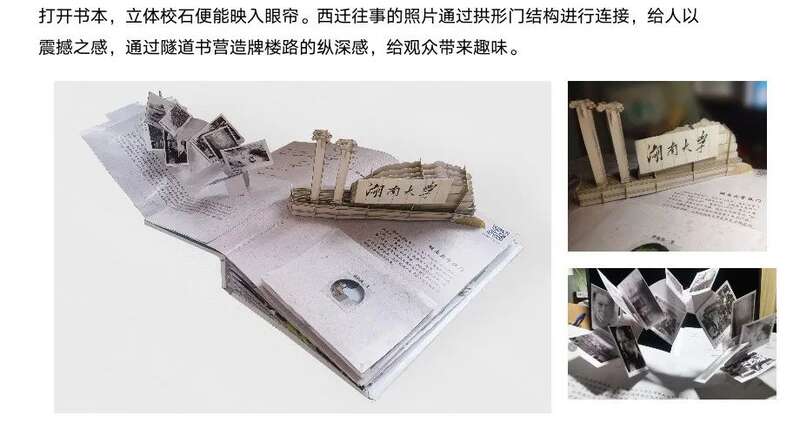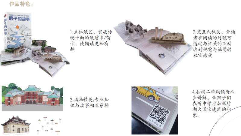 立体书所包含的文化符号表达远比一般图画书形象生动,变化多端的“互动性装置”,是本书的一大亮点。它不仅可以突破二维空间,让建筑活起来,而且可以增强阅读的趣味性与观赏性。将湖南大学建筑文化与立体形式相结合,能够实现建筑元素的图画、互动式传播,在给读者带去全新阅读体验的同时,也使得湖大建筑的文化内涵在潜移默化中得到认同。