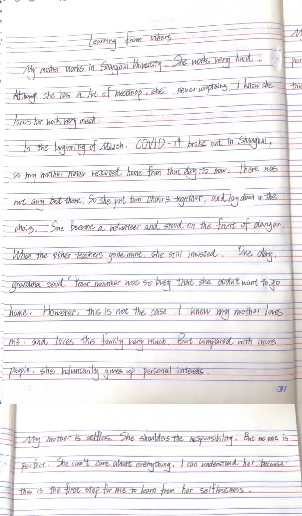 妈妈,请您不必担心,居家办公时我也会做好防护,照顾好自己,与您一同投身到学校的疫情防控工作中去,您也要多多保重身体,让儿子放心。相信在大家的共同努力下,我们一定能取得这场疫情战的最终胜利!