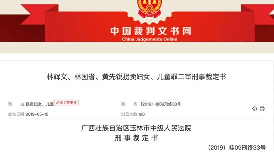 裁判文书网公布的由广西玉林市中级人民法院作出的刑事裁定书(林辉文、林国省、黄先锐拐卖妇女、儿童罪二审刑事裁定书)显示: