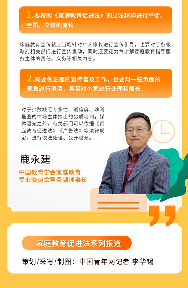 其次,既要做正面的宣传普及工作,也要对一些负面的现象进行澄清,甚至对个案进行处理和曝光。比如,法院和检察院对于不履行家庭教育责任的个别家长下达了《家庭教育令》,媒体进行了报道,对众多家长就是很好的提醒,这样的工作可以继续做。再比如,对少数唯利是图、缺乏专业性和诚信度的市场主体推出劣质培训的现象,除了媒体曝光之外,有关部门可以依据《家庭教育促进法》《广告法》等法律规定,进行依法处理、公开曝光。