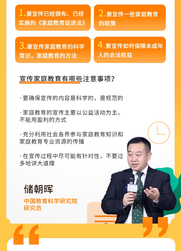 对于如何进行家庭教育宣传这一问题,储朝晖认为,应该宣传《家庭教育促进法》本身。