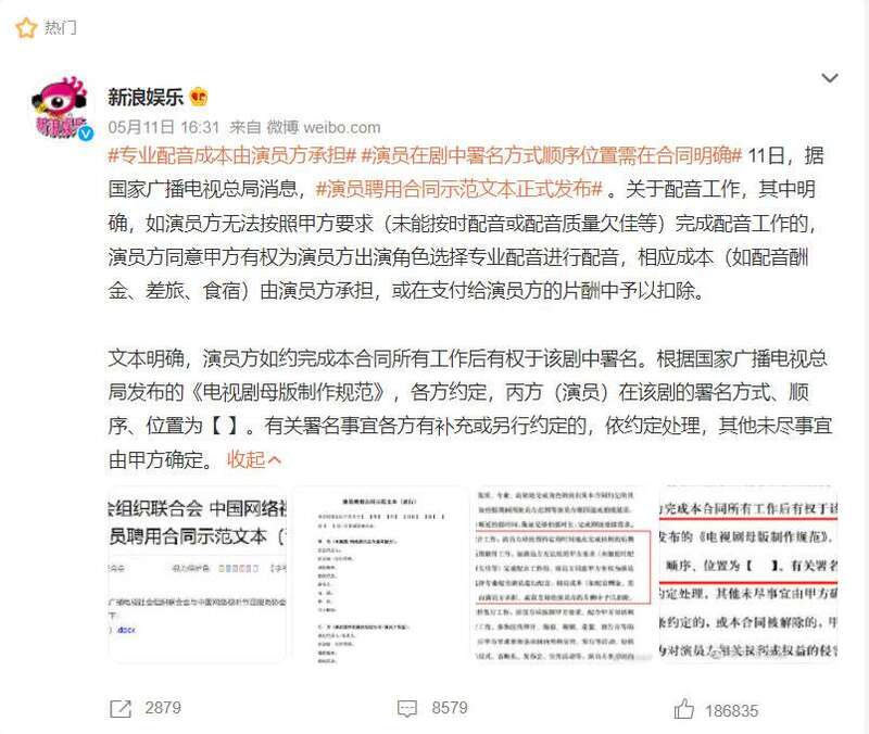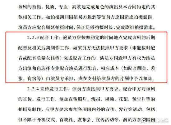 据国家广播电视总局微信公众号在5月11日发布的消息,经国家广播电视总局批准,中国广播电视社会组织联合会与中国网络视听节目服务协会共同制定的《演员聘用合同示范文本(试行)》正式对外发布。其中明确写到,如演员方无法按照甲方要求(未能按时配音或配音质量欠佳等)完成配音工作的,演员方同意甲方有权为演员方出演角色选择专业配音进行配音,相应成本(如配音酬金、差旅、食宿)由演员方承担,或在支付给演员方的片酬中予以扣除。
