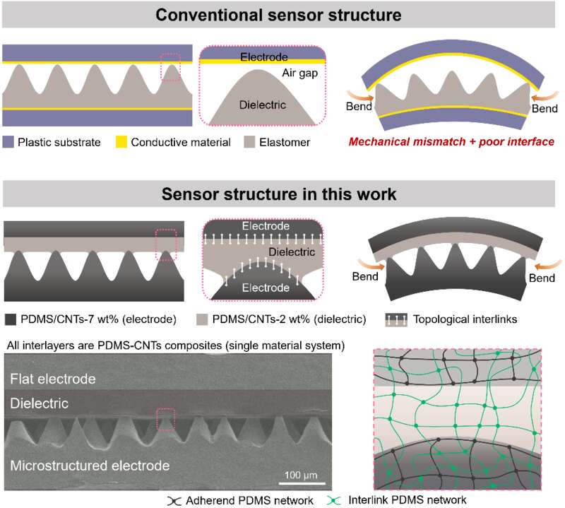 该研究的电子皮肤设计策略:传统传感器为多层异质结构,在形变下易发生界面破坏;本研究的同质器件结构和界面拓扑交联可以保持器件的稳定性