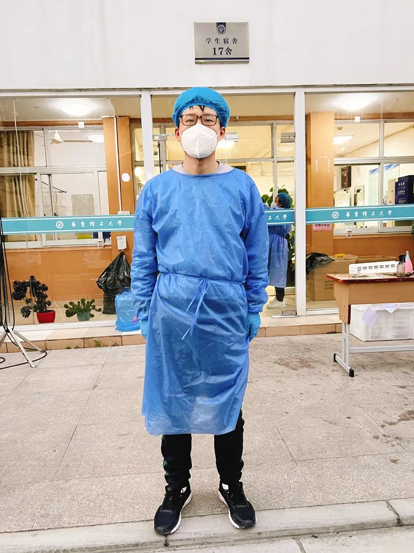 清晨6:30起床,穿上“华理蓝”,戴上口罩、护目镜,丁炜超一天的防疫工作从给学生分餐开始。6:50到达食堂,领取配餐送到学生宿舍,之后组织各层长下楼取餐,一日三餐,每天如此反复。同时,他还负责收集统计学生的各类诉求,奔波忙碌于学生宿舍17舍、食堂、校医院、南门口之间,为学生们取药送药、发放防疫物资、运送行李等。