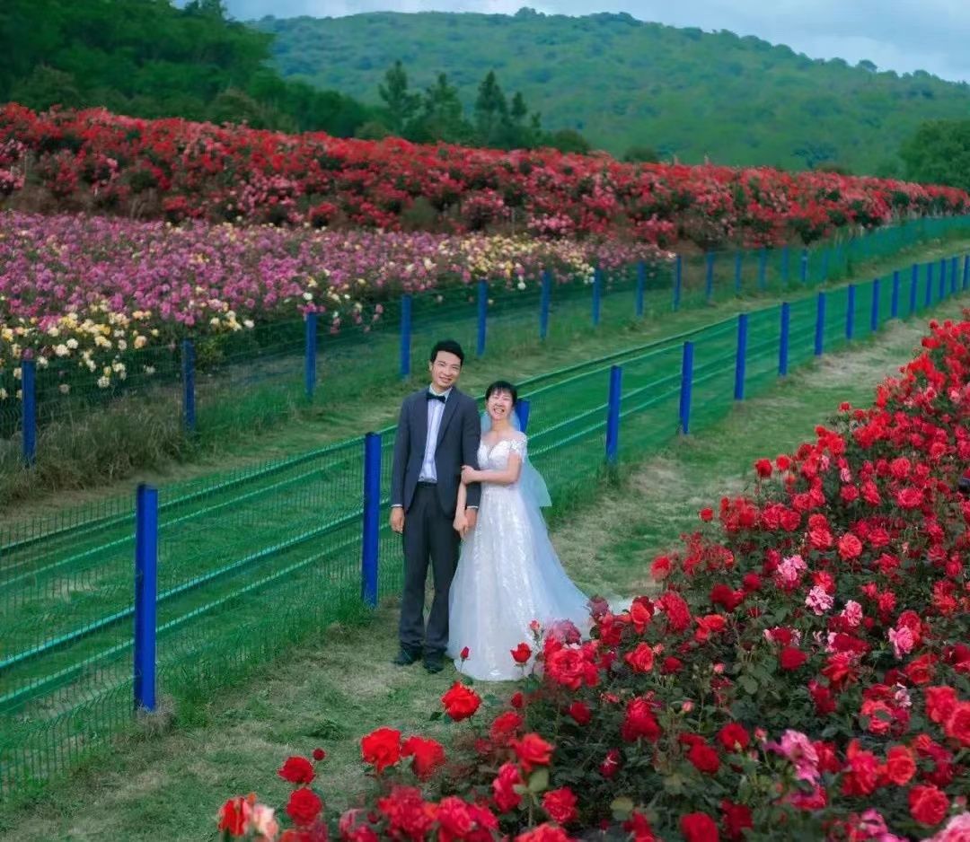 两个月后的5月4日,她在微博发布婚纱照,身穿白纱,与男友杨槠策互相依偎。妆容和笑容都算不上精致,与时下流行的影楼精修婚纱照大相径庭;背景是很浓的绿和开得异常热烈的花,大红配大绿,“通俗”到有些怪诞,十分余秀华。