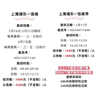 据吉祥航空公众号显示,吉祥航空还恢复了上海浦东 连城的航班,航班号为HO1145/1146,航班班期为5月16日至5月31日期间,每周逢周一、三、日执行,6月1日起每周逢周一、三、五、日执行。以及恢复了5月17日上海浦东 张家界的航班,航班号为HO1047/1048。
