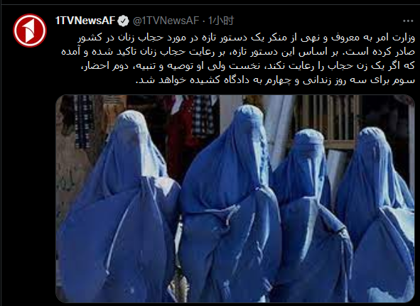 阿富汗1TVNewsAF推特报道截图,文字内容为该法令对女性的要求及惩戒办法。