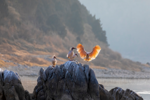 2021年1月28日,朱鹮在陕西省洋县黄金峡镇庞湾村汉江段的河石上栖息 陶本耀摄 / 本刊