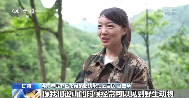 陇南市武都区裕河镇赵钱坝社区居民 潘宝琴:环境好了,我们巡山的时候经常可以见到野生动物,像金丝猴、羚牛、锦鸡等,以前真的很少可以看到。