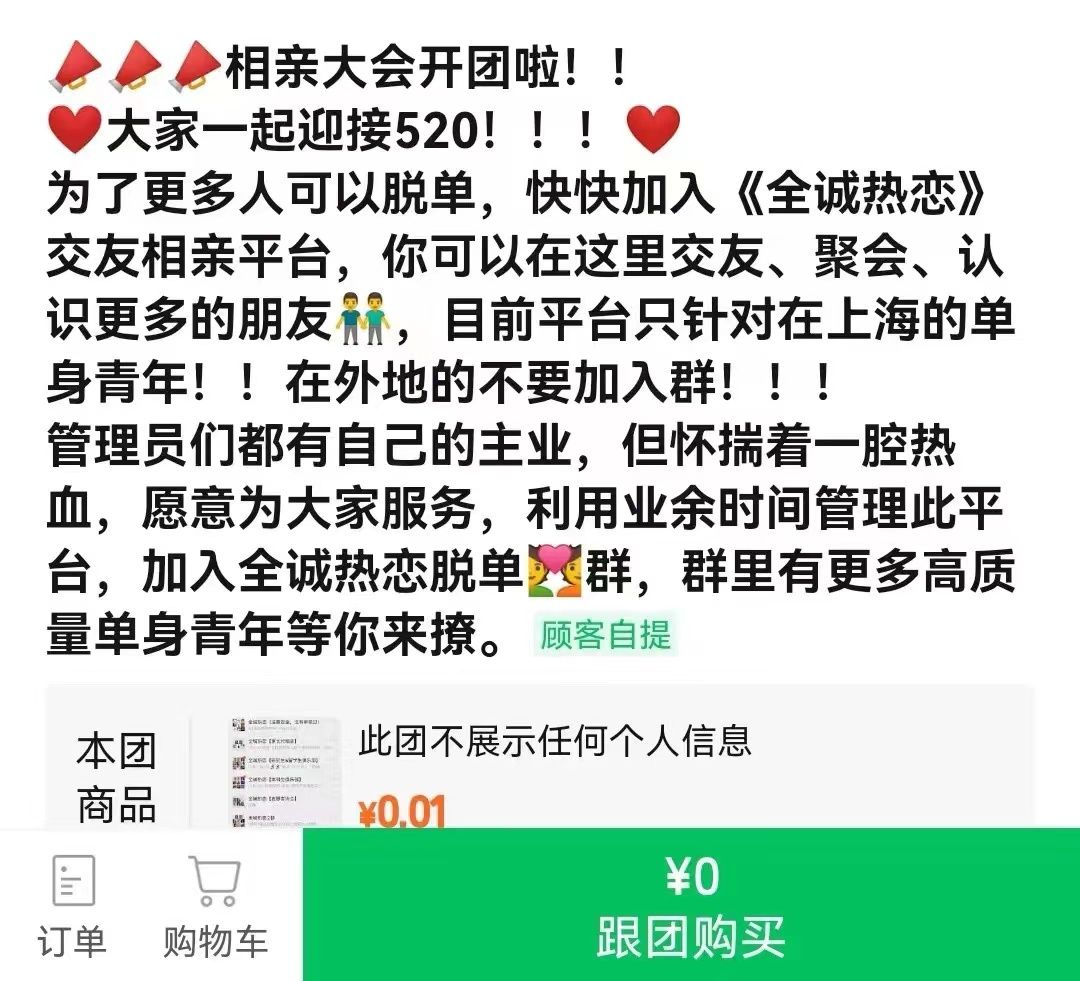 团购名叫“全诚热恋”, 商品栏里陈列着年轻男女的照片和基础信息,价格为0.01元。团购页里附着二维码,想报名的人可以扫码进群。“目前只针对在上海的单身青年!群主有主业,利用业余时间组建的这个脱单平台,提供大家一个交流平台……”尽管团购说明中再三强调不要拍链接,但后台数据显示,“货架”上展示的9个人,总共被“下单”一万多次。