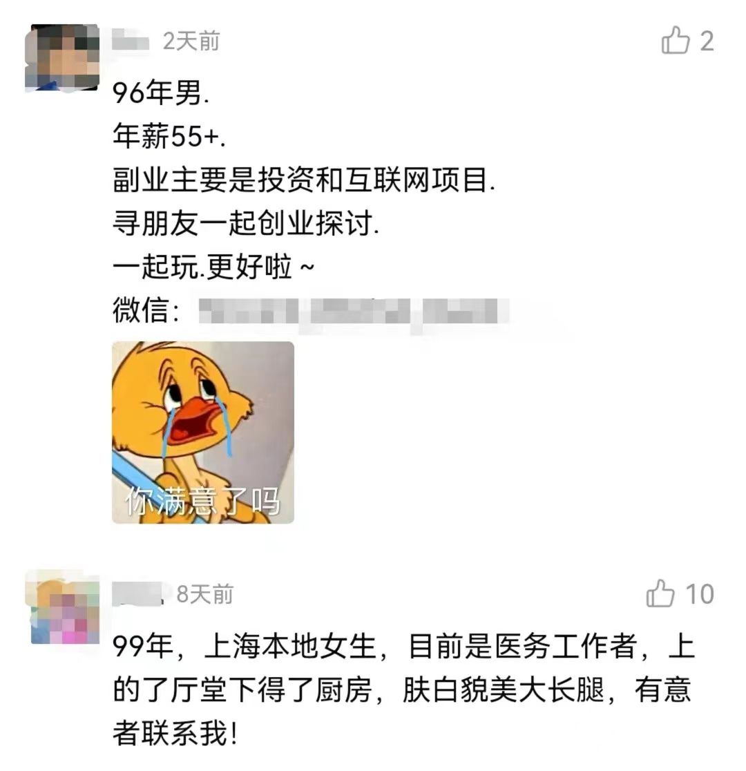 相处久了,“相亲”这个目的,反而显得没那么重要了——闷坏了的上海人,迫切需要一个“广场”,和许许多多的人攀谈、对话,找到社群感。在留言区,高频词是“无聊”“闷”。也有人在留言中征游戏好友:“有人带我打游戏吗?王者吃鸡都可以。”