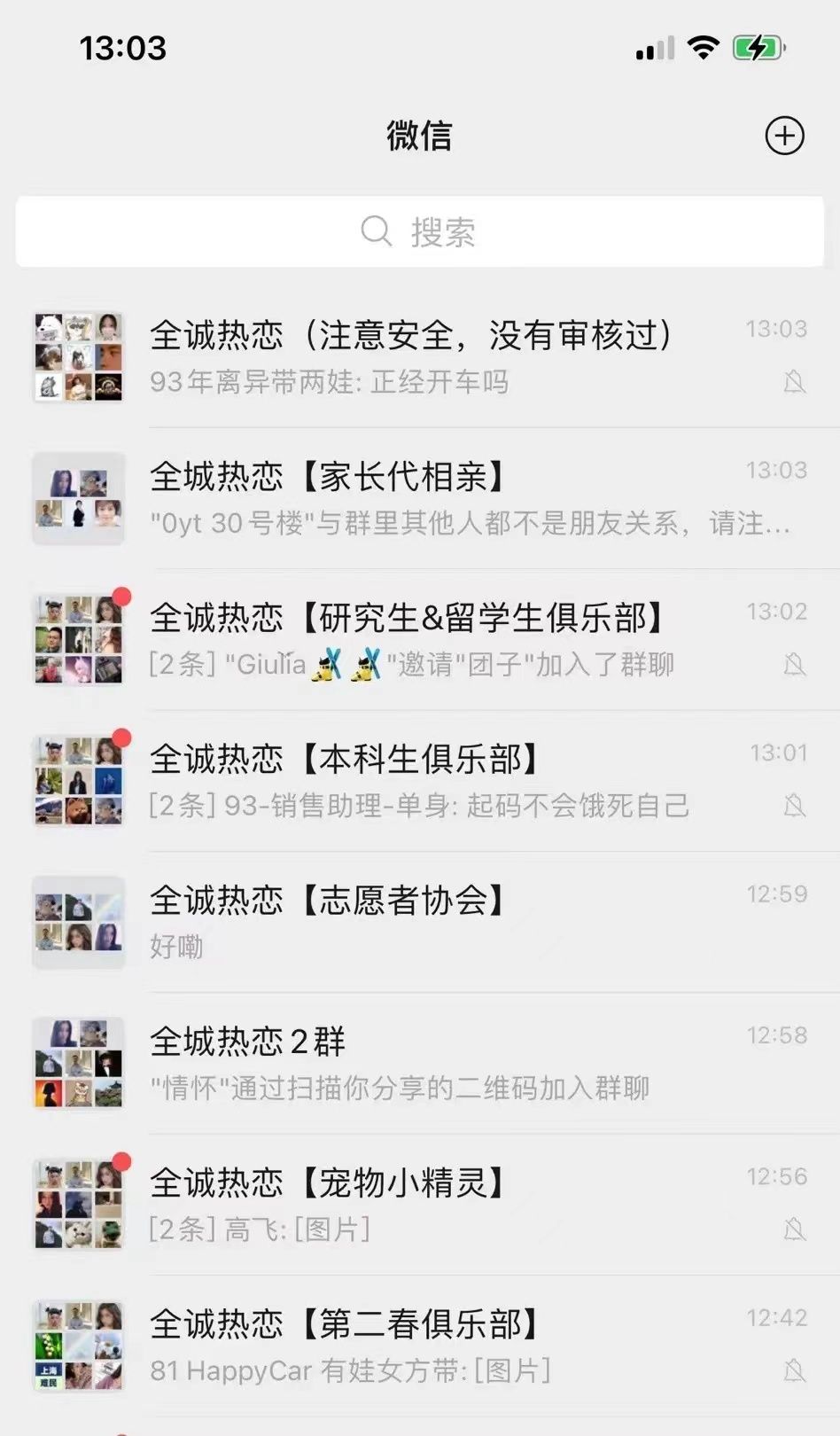 他们建立了一套新的流程:扫码报名的人先进入未审核群,然后根据兴趣选择对应的小群,向管理员提供资料后审核通过。分类后,大家的共同话题更加集中,宠物群讨论猫猫狗狗,研究生群常冒出某些研究领域的专有名词,在第二春群,则有人分享为什么离婚、孩子跟谁、财产怎么分。