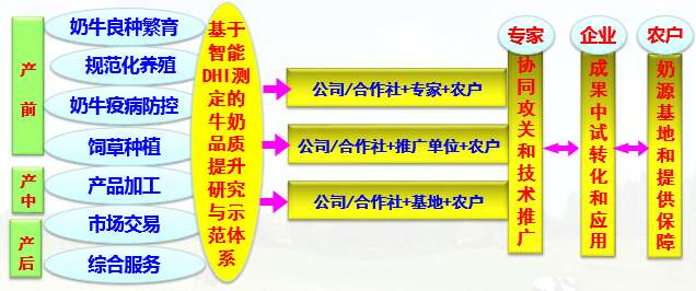 刘永峰教授团队自2015年以来,为解决良种奶牛生产性能测定方法不完善、牛奶营养与安全品质评估方法不健全、牛奶安全生产过程控制方法不健全等问题,开展了DHI测定与牛奶品质提升技术研究集成与示范推广。在服务良种奶牛选育过程中,建立和示范推广了基于智能DHI测定的奶牛育种性能测定技术,形成了奶牛选择新模式;在服务牛奶品质评估过程中,建立和示范推广了基于DHI测定的牛奶营养安全品质分子评估技术,实现了奶牛育种与牛奶品质评估的双重目标;在服务牛奶制品生产过程中,建立和示范推广了营养奶制品安全生产技术,无缝链接了奶牛养殖和牛奶品质。
