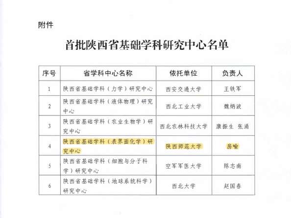 近日,陕西省科技厅下发了《陕西省科学技术厅关于组建首批陕西省基础学科研究中心的通知》,依托我校建设的陕西省基础学科(表界面化学)研究中心获批立项建设,是我省首批立项建设的6个基础学科研究中心之一。