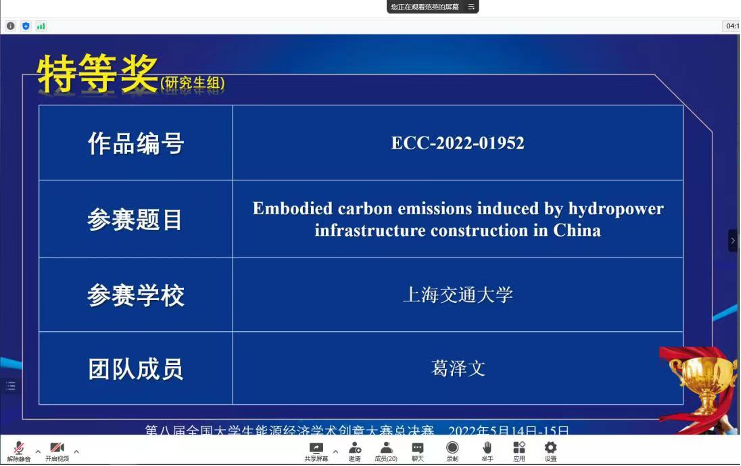 日前, 第八届全国大学生能源经济学术创意大赛全国总决赛 落下帷幕,由 上海交通大学中英国际低碳学院 硕士生葛泽文参与,耿涌教授、魏文栋副教授共同指导的研究项目《Embodied carbon emissions induced by the construction of hydropower infrastructure in China》 荣获大赛特等奖 。