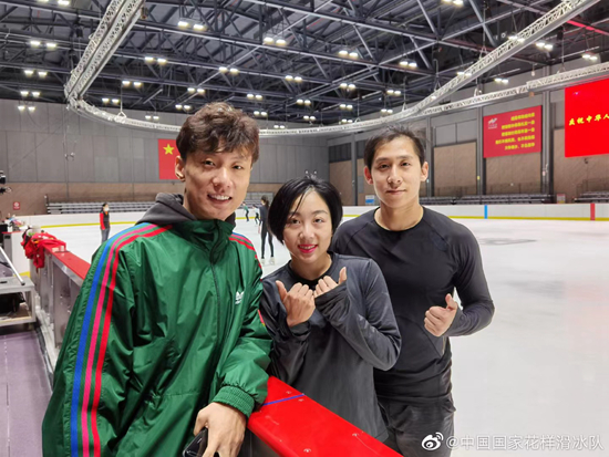 由中国舞蹈家协会推荐的青年舞蹈家李响正指导花滑运动员王诗玥、柳鑫宇进行舞蹈训练。中国花样滑冰协会供图