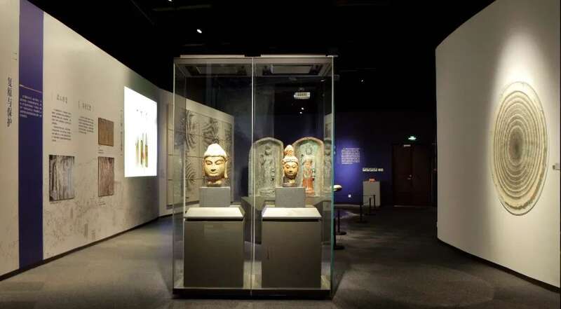 展览主色调采用了从上海大学校徽中提取的上大蓝、玉兰白,从龙门石窟文物中提取的赭石色,以期在色彩上形成两地对话。其中,白色作为主色调被用于当代艺术品展示,在局部形成“白盒子”展示效果。文化遗产部分则使用蓝色与赭石色,在色彩对话的同时,保持历史类展览的传统风格。通过三种色彩的组合搭配,使得展览在整体效果上摆脱了传统“环境暗、局部亮”的光照环境,当代艺术品的光源辐射至文化遗产部分,艺术提升了展厅的整体照度,让古代艺术与当代艺术更好地互相关联。
