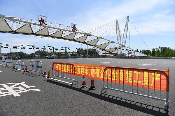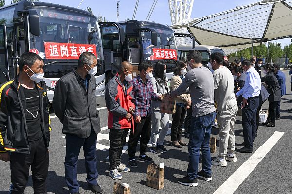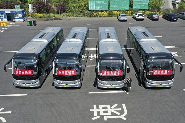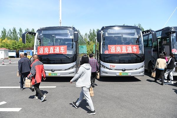 2022年5月22日10时,在吉林省长春市,4辆来自榆树市承载150名返长复工农民工的大巴车,到达长春高速东口。