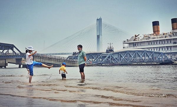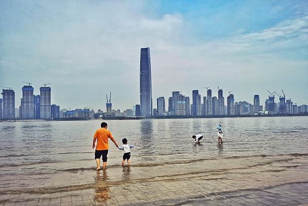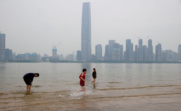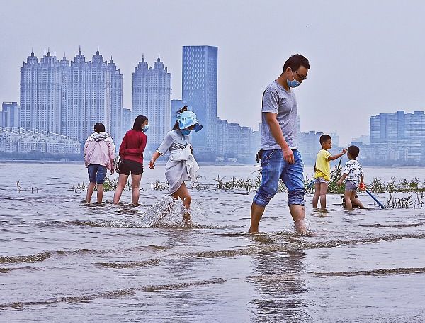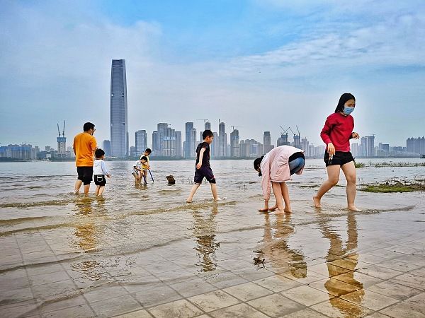 2022年5月22日,市民在亲水平台戏水玩耍。长江武汉段江水上涨,已漫上武汉汉口江滩三阳路广场低层亲水平台,亲水平台成了市民们的“水上乐园”。