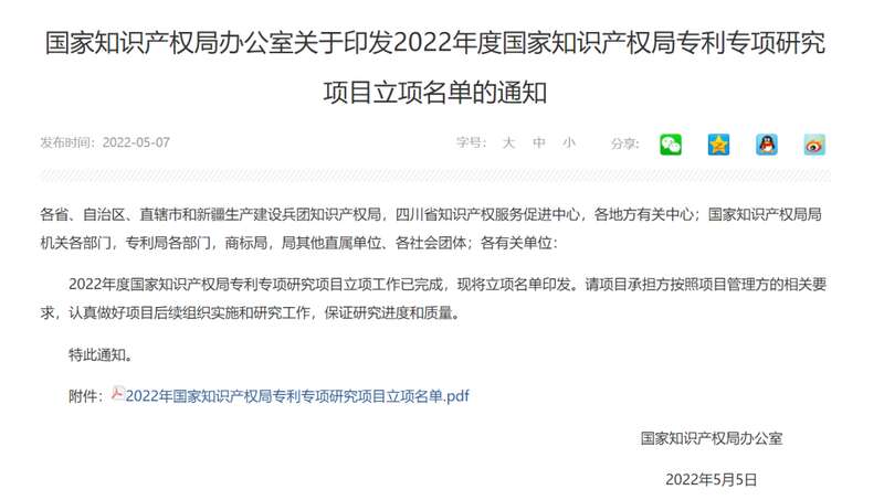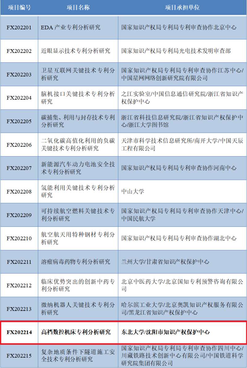 2022年度国家知识产权局专利专项研究项目专利分析类项目如下表所示: