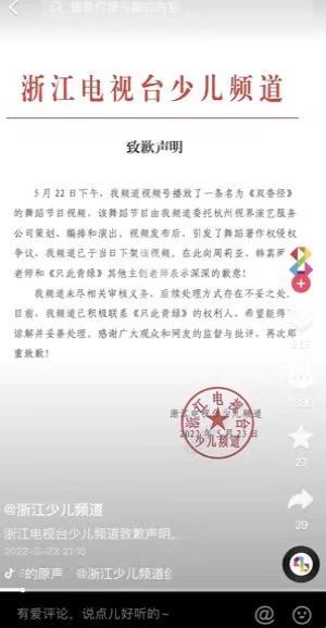 5月23日,浙江电视台少儿频道发布致歉申明,称该舞蹈节目是委托杭州视界演艺服务公司策划、编排和演出,已下架该视频,并已积极联系《只此青绿》的权利人,希望得到谅解并妥善处理。